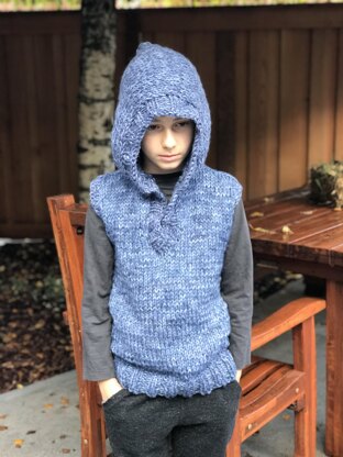 easy and fast to knit , this cozy vest with hood is knitted piece to piece and sewed together.