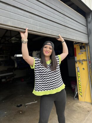 The Lucky Shirt was inspired by a look on the show Emily in Paris on Netflix. Using Lion Brand 24/7 Cotton makes it not only classy in color, but also durable in wear. The crochet technique used minimizes ends while giving the illusion of a checkerboard with stripes.