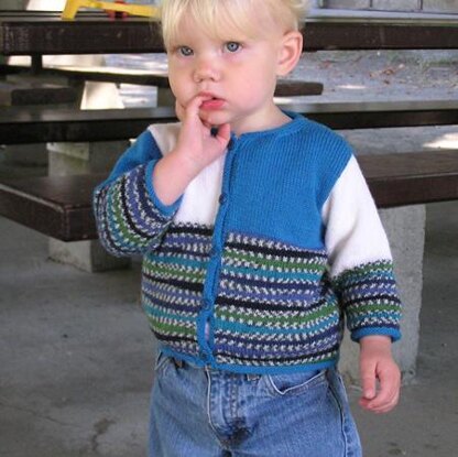 Building blocks inspire a cardigan for the really active child. The solid coloured upper section contrasts beautifully with the jewel-like tones of the self-patterning yarn.