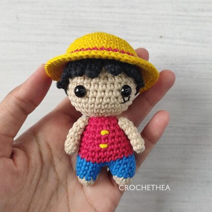 Luffy amigurumi is about 9 cm (3.5 inches) tall. I used small ply balinese cotton yarn (8 ply sport yarn) and Tulip hook no. 2/0 (2 mm hook).