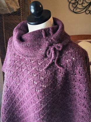 Lulu, Rosemary & Shelly is a Iightweight poncho, constructed with minimal seaming & shaping. Details include contrast hem & collar facings, integrated I-cord edge, & a geometric design featuring mini cables & lace. Front & back are worked separately, then joined at the shoulders with a 3-needle bind off. Stitches are picked up around the neck in order to work the collar. Leave the sides open, or secure them with optional buttons or i-cord ties – instructions are included for both.