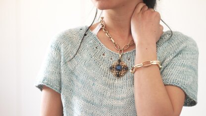 Luminous Summer is a simple tee worked from the top down. It has minimalistic finishing with a row of eyelets delicately framing the face. It has a unique placement of short rows that shapes the neck without disrupting the neckline. This cropped tee uses very little yarn, making it the perfect project to indulge in exquisite yarns.