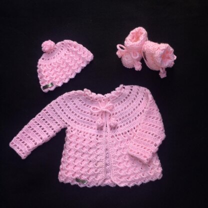 LUNA CROCHET BABY CARDIGAN HAT & BOOTIES PATTERN PDF - A pretty lacey baby jacket | sweater | cardigan, hat and booties set. Jacket and hat made seamless top down and booties in the round bottom up. Pom-poms are crocheted so will never unravel!