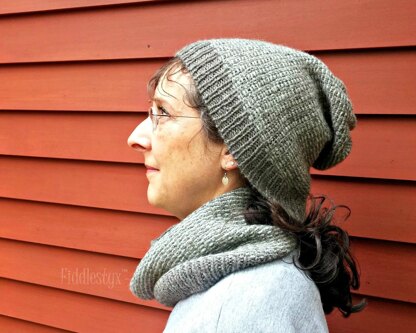 This reversible cowl and hat set was inspired by the markings on the barred owls near my home. The pattern uses clever slipped stitches and only one color per round to create a fully reversible fabric. Vertical stripes on one side and tweedy horizontal stripes on the other.