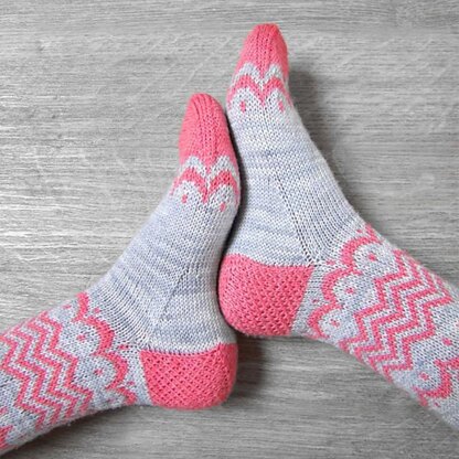 Worked partly in stockinette stitch and partly in a simple stranded colorwork pattern, these socks were created to add a pop of bright color to your outfit. The socks are worked from the cuff-down, with a standard heel flap (which can be easily replaced by your preferred method) and a bit of kitchener stitch to close the toes. This pattern is needle-neutral (to work with either DPNs or circular needles).