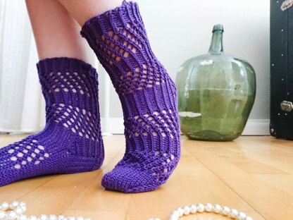 Toe-up sock, with swirly stripes that continue from the tip of the toes up to the cuff. The sock consists of left- and right-leaning mesh and rib sections to form a full wavy design.