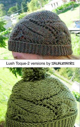 Two hat versions: One features a seed-stitch top, the other is in stockinette. Designed to complement the 'Lush Lace Stole with leaves and acorns'.