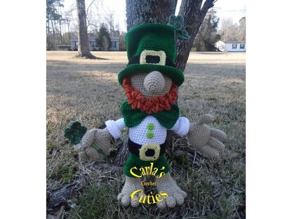 Luther Leprechaun is approx. 20 inches tall. The pattern has 15 pages of step by step instruction with fully detailed color photos. This pattern is good for beginners. You will need to have an understanding for simple crochet stitches such as sc, dc, hdc. You will also need to know how to inc., dec., work in the round, plus work in rows. The main colors used in this pattern are: Paddy Green, White, Carrot, and Buff. You will also need some Black, Cornmeal, and two shades of green of