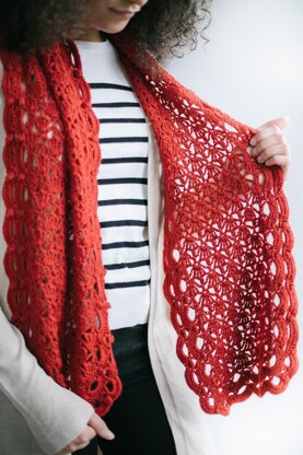 Lace and a scalloped edge dotted with popcorn stitches create this elegant scarf perfect for all occasions. This piece can be worn as a scarf or wrap, and the look and feel of our Simply Suri yarn in this pattern will make you feel pampered!