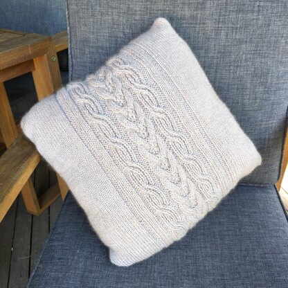 The Luxe Cushion Cover is a cosy, stylish cushion cover with a large cable surrounded by smaller cables, knitted flat, in two pieces. The back is in plain stocking/stockinette with a button band down the middle. This is a plump fit for a 40cm (16 inch) cushion insert.