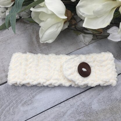 his headband uses Bernat Blanket yarn for extra comfort and water absorption. The button up closure ensures you won’t mess up your hair or make up either!