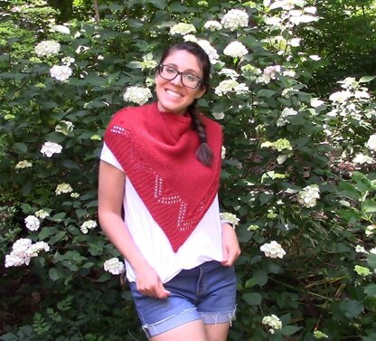 Knitting of this shawl starts at the small point and increases along one edge to create a right triangular shawl. It features simple garter stitch with decorative edge patterns. The patterns include eyelets, decreases, and low-profile bobbles.
