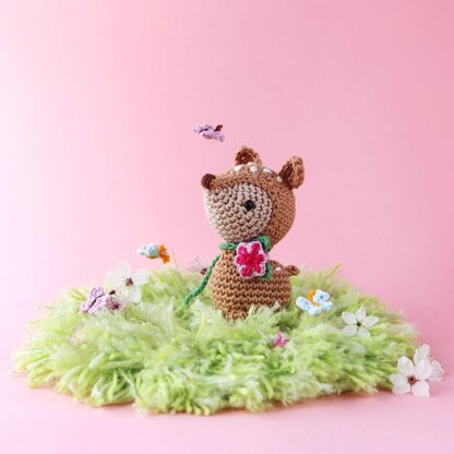 The projects can be made with your preferred yarn, all the samples were made in DK-weight cotton with 3.0mm hook. The fawn measures approx 13 cm (5 in) tall if made using the suggested yarn.