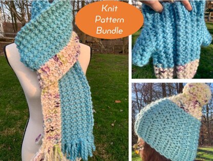 The Macari bundle includes the patterns for the hat, mittens and scarf. The patterns use Premier Yarns So Woolly, a #6 super bulky yarn, in 2 colors.