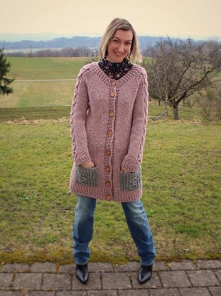 Tasty and toasty: Macaron will keep you warm on cooler days. Easy to wear, a fast knit due to the large needle size, and an interesting one with the cable details running along the back, the sleeves and the pockets. Use the same color throughout for a more classic appearance or work the bands or even the cable pattern on the back in a contrasting color for more interest.