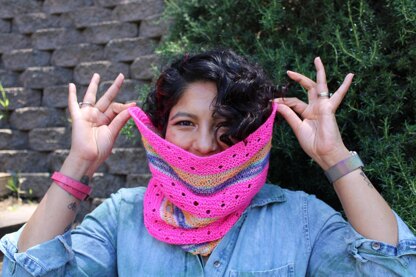 This super fun, quick knit uses the stitch patterns from the Mad Bee Shawl to create an accessory that is easy to throw on. Mix and match 4 colors of fingering weight yarn from your stash or scraps.