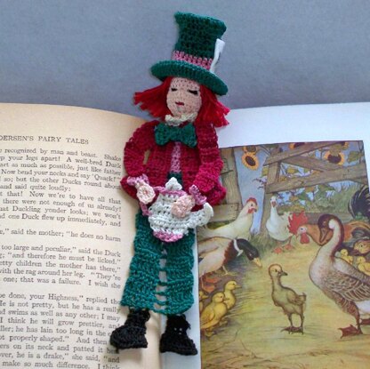 I made this reading character bookmark for anyone who enjoys the Mad Hatter’s flair. The crochet stitches include, sc, hdc, dc, tr and sl st and front loop and back loop work. The pattern includes description of abbreviations and complete instructions. This is a fun bookmark for the experienced crocheter to make. It uses small amounts of crochet thread and any colors can be used so it is a great project to use up small amounts of crochet thread (28 yards being the most that is needed). Materials: bedspread weight cotton thread (size 10) 10 yards peach (or choice of skin color) 10 yards dusty rose (or choice of shirt, hat sash & teapot accent color) 14 yards burgundy (or choice of jacket color) 28 yards spruce green (or choice of pants & hat color) 5 yards cream (or choice of “Unbirthday Party" teapot and collar) 4 yards black (or choice of shoe & eye color) Small amount red (or choice of mouth color) could also use embroidery floss Uses U.S crochet terms