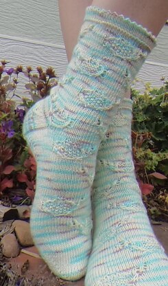 Steaming teapots dance over this fun and fanciful sock. The sock begins with a picot cuff, lacy steam, and teapots are formed with cables, slipped stitches, and texture.