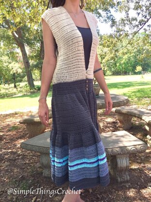 This gorgeous dress is so simple to make. It’s just four panels sewn together with a few rows of increases to create the flounce. It’s made with Lion Brand 24/7 cotton, but I think it’s more of a transitional piece for summer into fall because of the weight of the yarn. There's a lot of cotton yarn here, guys, so it's going to feel heavy, but trust me - it’s incredibly comfortable to wear, and the open top helps to keep it cool. And those amazing colors and the stitch definition from this yarn make it an absolute standout!! Other than the five buttons, it’s a totally open front so you’ll need to wear leggings and a tank top with it, but I think it would be awesome with a turtleneck and boots in cooler weather. I've included sizing from XS to 3XL, but be aware that this is a fitted dress at the hips, so the sizing may seem on the small side. You will need Lion Brand 24/7 cotton yarn in Ecru - 2 skeins, Charcoal - 6 skeins, Silver - 3 skeins, Aqua - 1 skein, Purple - 1 skein.