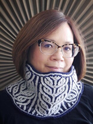 Madrona trees are native to the Pacific Northwest. They have gorgeous peeling bark, shiny leaves, and little berries. This cowl features leaves and optional small bobble-like berries. I knit most of the blue cowl (no berries) while at Madrona Fiber Arts Festival, and the name seems to fit. The green sample has berries on the vertical columns.