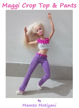 You will love to make this Maggi Crop Top And Pants Crochet Pattern! Maggi is a set of crop top and pants made specially for dolls. This sporty clothing fits a 12” Barbie doll. The pants fits snugly on the body with a slight bell bottom flare. The top is in a short blouse style. It can be worn as an off shoulder, crop top or as a sleeveless top. The bottom back of this form-fitting top has a small peep hole with a button closure.