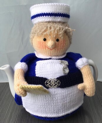 The main tea cosy is knitted using two strands on DK held together on 4.5mm needles. All other pieces are single strand DK I used Boucle yarn for her hair but DK could be used instead. I used a buckle embellishment but there are also knitted instructions included.