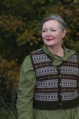 Maggy was inspired by the simple, geometric recurring motifs found in Margaret, from The Vintage Shetland Project. I have used just two motifs throughout. Rather than create another cardigan, I decided to create a colourwork waistcoat, providing warmth when needed but easy to remove when the temperature increases. The bands and welt are knitted in moss (seed) stitch echoing the finishing touches found on Vaila and creating a neat, stylish edge. Buttons are added purely for decoration with press fasteners also used.