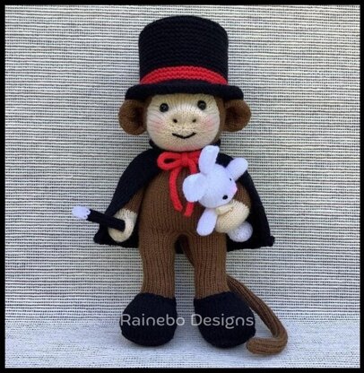 This adorable Magic Monkey is knit in the round, (Intermediate Level), using Magic Loop (or double pointed needles). It is approx. 12” tall (without hat) and is created using #3-light wt. (DK wt.) yarn. Needles needed: size 3 (3.25mm) & size 5 (3.75mm) 32” Circular Knitting Needles (if using Magic Loop). The legs, body, arms, and head are all knit on as you work along. The muzzle is added later. The cape and hat are removable. Pattern includes directions for monkey, bunny, cape, hat, and wand.