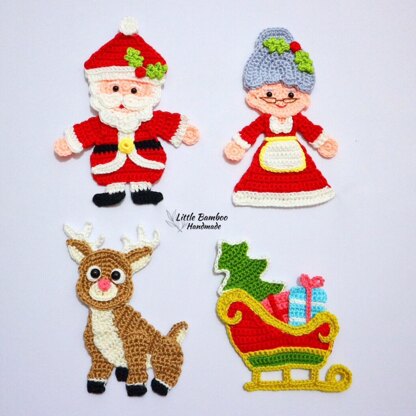 Written in English using US terminology. Set includes 4 patterns : 1. Santa Claus 2. Mrs Claus 3. Rudolph 4. Sleigh Materials: • 4 Ply Fingering Acrylic Yarn • Crochet Hook Size 3 mm • flat bottom black eyes