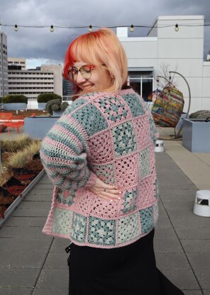 This one is sized a little differently too, just due to the way the granny squares measure. If you adjust the amount of rounds and do a little math you can always make this more fitted and less oversized. For reference, I am 5 foot 2 inches tall, with a chest measurement at 39 inches, and weigh about 140 pounds and made my sample in size 2.