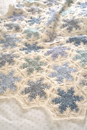 Flurries of magical snowflakes are captured in a beautiful drift to make this blanket constructed of individual motifs, each incased and joined as the blanket is worked with a decorative border added to compliment the design which shows off the pretty snowflake points at either end.
