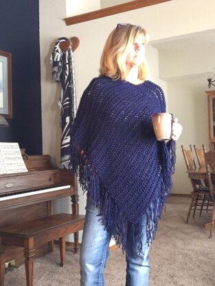 This poncho is knit on any 3/4" gauge loom with a minimum of 40 pegs, like the yellow Knifty Knitter round loom. The poncho uses approximately 980 yards of a soft worsted weight yarn.