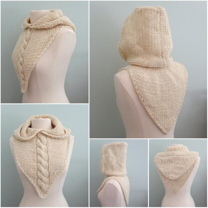 Maid Marian’s Hooded Bandana Cowl is the companion pattern to Robin Hood’s Bandana Cowl. Marian’s Hooded Cowl has different features such as a moss stitch hood border, a cable patterned front, and a slightly smaller hood.
