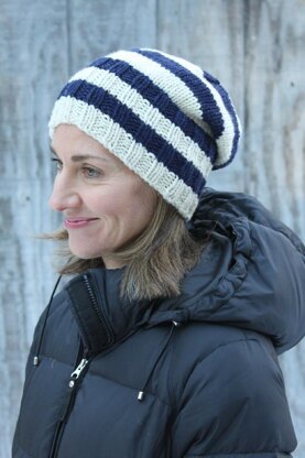 This hat features a wide ribbed brim, stripes, and a slightly slouchy style. Quick and easy to knit. Warm and cozy for our cold Maine winters.