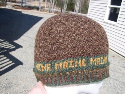 VARIATION: If the knitter would like to leave out the word "Maine", a different motif, such as trees could be knit in, or just 3-5 plain green rows. The hat is deep enough for most people so that three plain green rows would still be deep enough to cover a man's ears.