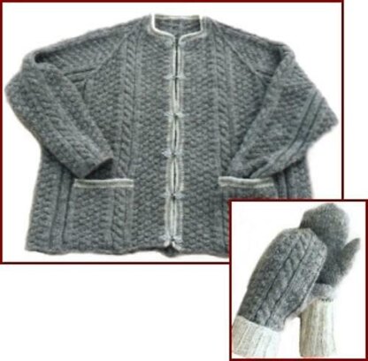 About the Design: This one size raglan cardigan was designed for everyday wear. It has textural interest, without being complicated to knit, and an easy shape, that will look good on wearers of many sizes. The roomy pockets and front opening are edged in single crochet and slip stitch. Elegant pewter clasps add the finishing touch. Matching mittens have long cuffs for folding up or leaving long, on windy days.