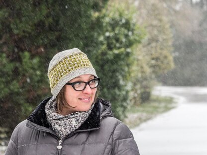 Yarn approximately 130 (155, 185) yards total worsted-weight yarn. I used Brooklyn Tweed Shelter in Snowbound (cA) and Sap (cB) for the lighter grey hat, and Soot (cA) and Sap (cB) for the darker grey hat.