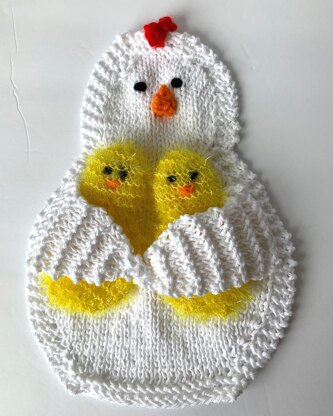 This is the cutest kitchen gift ever, to give at any time of the year! The baby “chick scrubbies” fit nicely under Mama hens’ front wings. Mama Hen is made with washable cotton yarn for a kitchen dishcloth, the baby chicks are made with a washable “scrubby” type yarn. Store this with chicks under wings, or when using, lay aside the hen dishcloth and chicks to dry separately. This is a great novelty gift that will bring loads of smiles to anyone that has a kitchen! Use worsted weight cotton and scrubby yarns, knitting needles, US # 8.