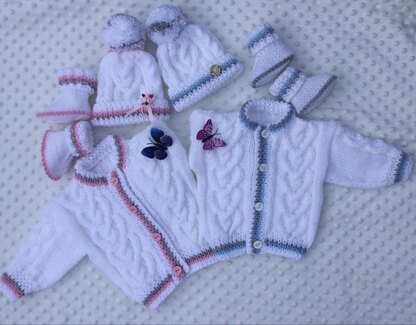 Designed by myself, this Aran pattern consists of instructions for Jacket, 2 styles of Hat and Bootees to fit 16", 18", 20" and 22" chest. It is the very first design I created and has been my biggest seller to date. This pattern is the first of a collection I will be rolling out over the next few weeks. Pattern is in English terms.