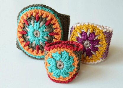 This bracelet can be adjusted for kids and adults! It can become a great last minute gift and a nice idea for kids party. It is a quick and colorful project. And it is also an excellent chance to learn the basics of overlay crochet. The bracelet consists of a round mandala and a crocheted strap with a button.