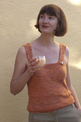 A mango lassi is a hot weather yogurt based drink from India, refreshing and relaxing. Mango Lassi is a simple knit tank top, relaxing to make and wear, and easy to style. Knit in a drapey fingering weight yarn, the top breathes and makes use of the Outlast © to keep you cool and comfortable in the spring and summer heat. An easy twisted stitch textural argyle pattern in the bottom corner of the tank adds interest to the knitting and a cute detail for later. Knitted in one piece to the bottom of the V back detail, Mango Lassi is then knit flat with the V back becoming the two tank top straps. Rather than place all the weight of the top on the two buttons, the straps are seamed to the garment and decorative buttons added afterward. This is a great project to show off your favorite buttons!