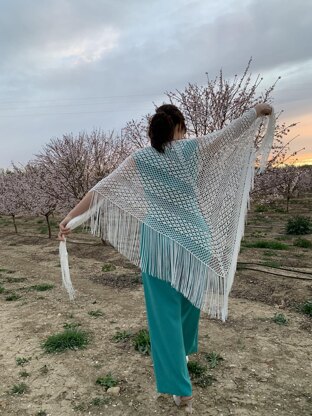 Mantón de forma triangular, tejido desde arriba hacia abajo. Diseño de novia. Puntos utilizados: cadeneta, punto alto, punto alto estirado, nudo de flecado. Medidas finales adaptables modificando el número de vueltas. Muestra de tensión especificada en el patrón en la página cuatro. Incluye esquema de puntos y explicaciones escritas para realizar los nudos.