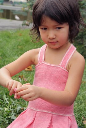 Knit in a fingering weight yarn, this is a sweet sundress that will be adored by any little girl. The dress is worked in one piece from hem to top, with pleats at the waist to create a full skirt - great for twirling in!
