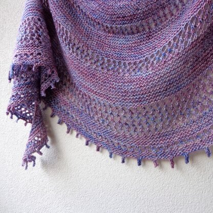 The shawl is worked top-down in one piece from the centre out as a crescent shaped shawl with a curved top edge. It is worked in garter stitch with alternating lace bands. A picot edging makes a beautiful finish for this modern & feminine accessory.