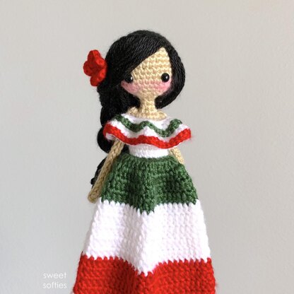 Marcela the Mexican Doll is a member of Sweet Softies’ Darling Dolls International Series. Marcela is a Spanish lady wearing a traditional Mexican dress with the colors white, green, and red. She loves to sing and dance to Latin music, and adorn her hair with large, vivid flowers to match her equally-vivid personality. Add this gorgeous doll to your multicultural collection of amigurumi crochet female dolls from around the world!