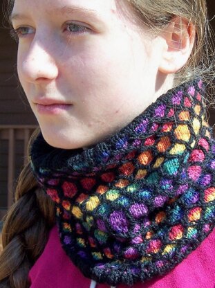 Based on an original variation of the stitch pattern EZ mentions in Knitter’s Almanac for her March sweater, this two-color pattern really pops with the solid black contrasted with the multi-colored (the cowl takes approx 230 yds of solid MC and 370 yds of the multi - for a total of 600 yard needed).