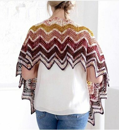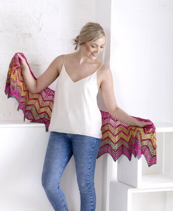 A beautiful crochet shawl pattern designed for Manos Yarns UK by Tina Jane. Features a striking zig zag pattern and style. Made using one skein of Manos del Uruguay Silk Blend Fino and one set of Silk Blend Fino Miniskeins (each set contains 5 miniskeins in complementary colours)