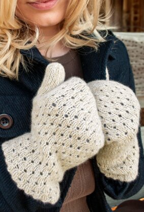 The inside mitten is worked straight in St st, the outer mitten is worked in an eyelet lace pattern around the wrist and on the back side. Thumb sts for the inside mitten and the outer mitten will be picked up and worked separately. Kitchener St is used to seam the top of the mitten.