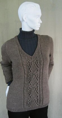 Classic while still contemporary, this V-neck pullover is the perfect way to transition from work to play. Wear it the office, then dress up a pair of jeans for after hours. This is one piece that will look great in almost any color, though solid or semi-solid colors will look best. The name comes from the single pattern motif on each sleeve, which reminded me of a butterfly. The body is worked in the round to the beginning of the V-neck shaping, with the lace panel on the front only. After dividing the work to begin shaping the front neck, work is further divided at the armholes for the front and back. The sleeves are worked in the round to the underarm length, then the sleeve cap is worked back and forth. A single pattern motif is worked on each sleeve, then work continues in stockinette stitch.