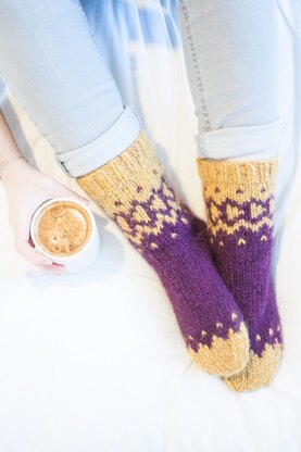If you’re in a hurry for comfy and warm socks, you’re in the right place! Knitted with bulky yarn, it will only take you a few hours before you’re able to wear your new boot socks. Worn indoors, they will make perfect winter slippers and keep your feet from getting cold.